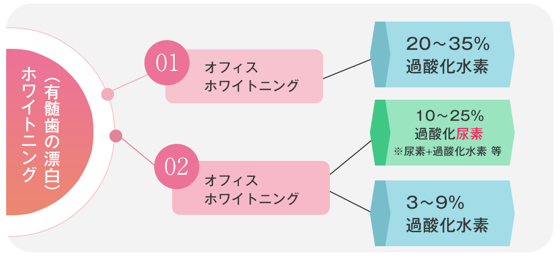 どちらも過酸化水素や過酸化尿素を使用した有髄歯にのみ行える歯の漂白で、オフィスはエナメル質の強度な漂白を目的とし、ホームはエナメル象牙質付近の漂白を目的とするのでホームのほうが自然な歯の色に近い漂白が可能です。